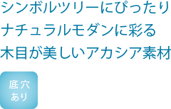 使用しているアカシア材は、分厚く、程よいフシ目が美しい木材を厳選し、アカシアの見た目を変えない程度に表面にマットのクリアを塗り、無垢で自然な質感を保ちながら木を保護しています。